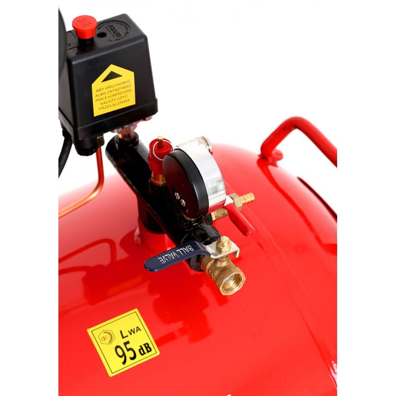 - Ergonomiczny - posiada reduktor ciśnienia wyposażony w innowacyjny mechanizm regulacji, duży manometr usytuowane na kompresorze w pozycji ułatwiającej odczyt parametrów oraz wygodny w eksploatacji kranik spustowy.