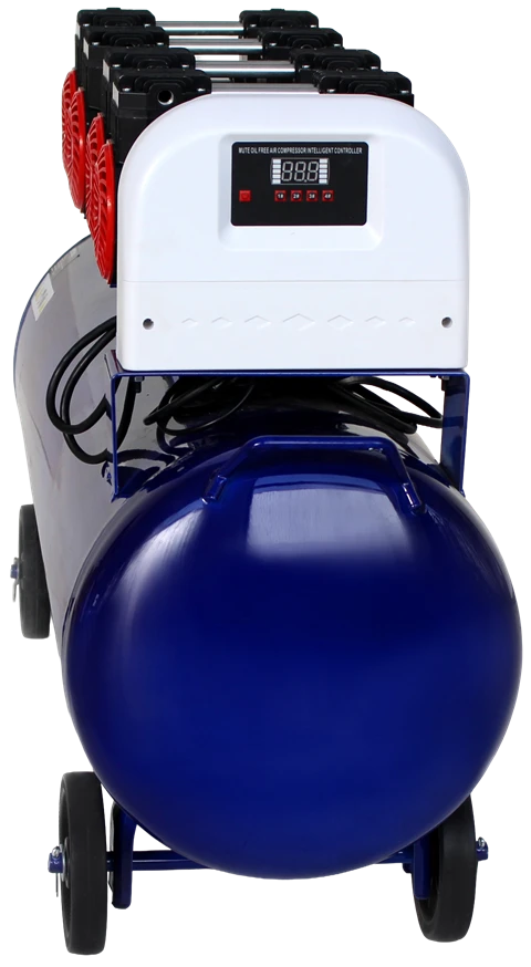 Głowica cylindra oraz kluczowe elementy sprężarki wykonane zostały z wysokiej klasy stopu żelaza, co pozwala na uzyskanie bardzo wysokiego stopnia kompresji powietrza i praktycznie eliminuje ryzyko nieszczelności. Konstrukcja bezolejowa zapewnia czyste powietrze robocze, brak potrzeby stosowania filtrów oleju oraz mniejsze wymagania serwisowe. Całość dopełnia nowoczesny panel sterowania oraz solidny zbiornik powietrza zaprojektowany z myślą o bezpieczeństwie i długiej żywotności.
