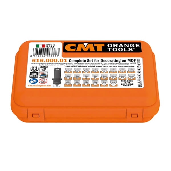 Unikalny zestaw zawierający korpus narzędzia oraz 22 rodzaje profili kształtowych przeznaczonych do wielokrotnego zastosowania na maszynach CNC. Przeznaczony do MDF, laminatów, forniru, plastiku oraz drewna. Korpusy frezów CMT wykonane są z najwyższej jakości stali szwajcarskiej oraz posiadają lutowane ostrze HM i pomarańczową powłokę teflonową która wydłuża żywotność narzędzia i poprawia jakość pracy.
